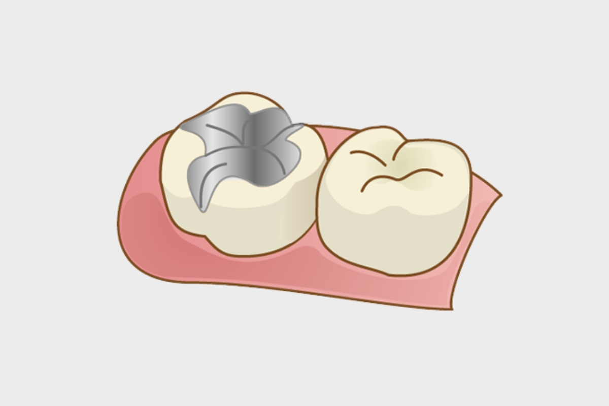 一般的な銀歯です。銀やパラジウムを使用した銀合金で、保険が適用できるインレーです。銀色のため審美性に乏しく、他の素材に比べ虫歯再発のリスクがあり、金属アレルギーになる可能性もあります。