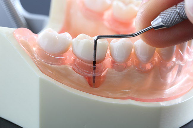 目盛りのついた器具で、歯と歯ぐきの間(歯肉溝)の深さを測ります。深いほど良くないことが多いです。