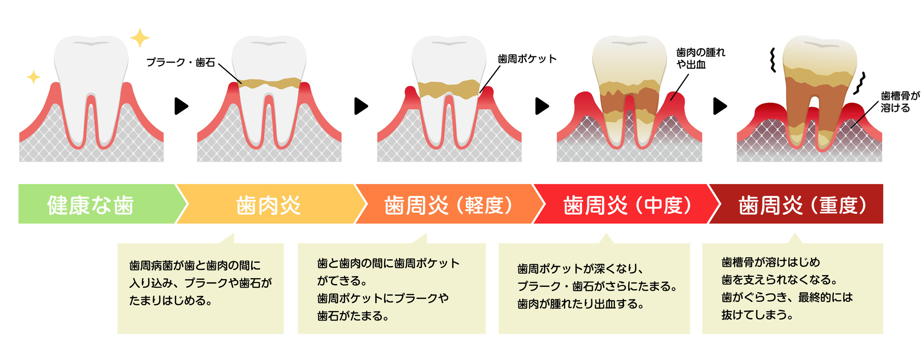 歯周病は全身の健康とも大きく関係しています。歯周病は、口の中に細菌感染が進行し、体の免疫系がそれに反応し起こる慢性疾患です。